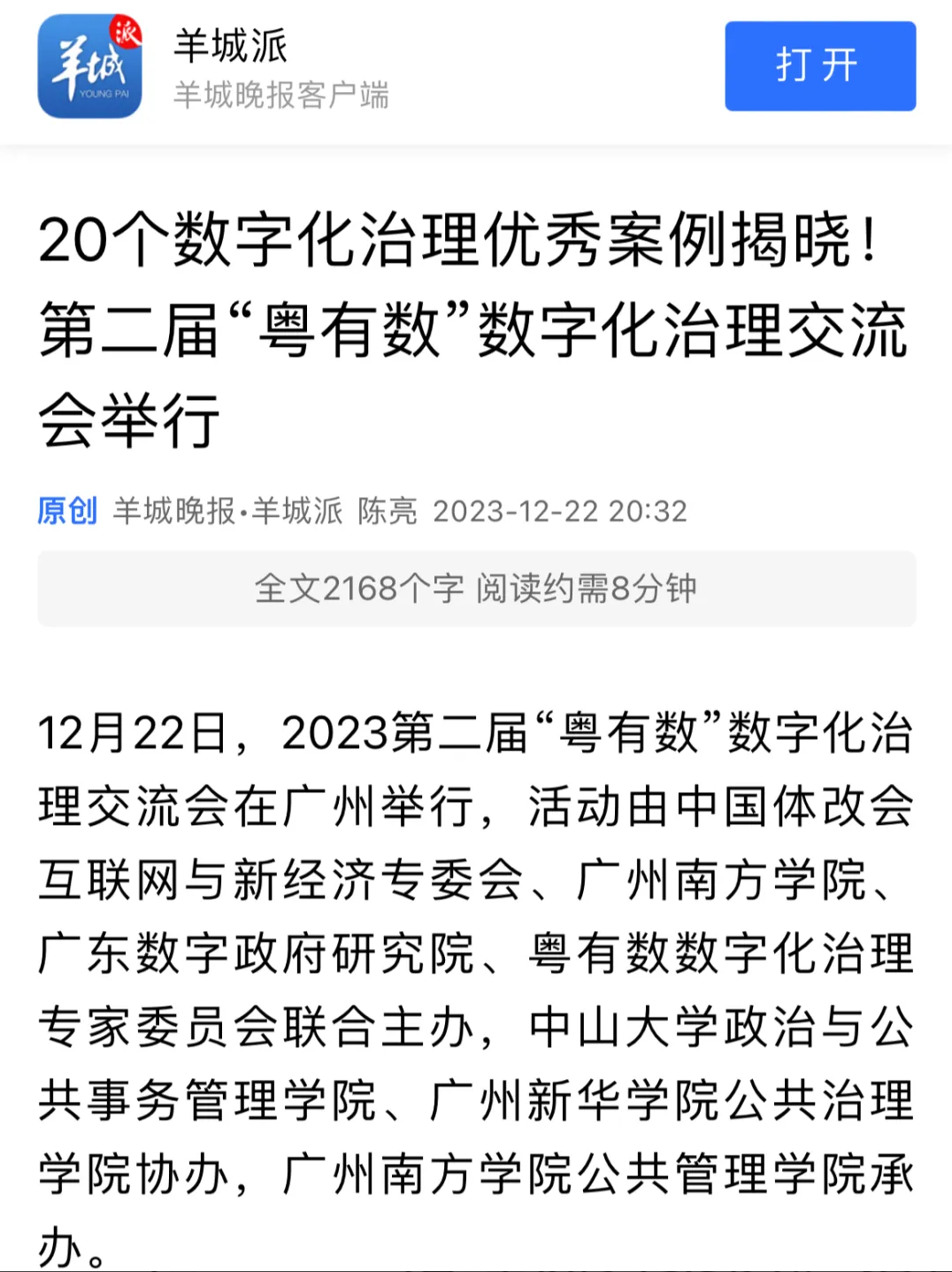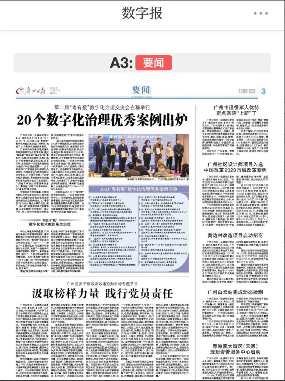 第二届“粤有数”数字化治理交流会被新华社客户端、南方报业传媒集团南方+、南方杂志、南方都市报、南财集团21世纪经济报道、羊城晚报、广州日报要闻版和广州市人民政府网、越秀政务等多家中央级、省级和市级媒体及优秀案例获奖单位公众号报道。
