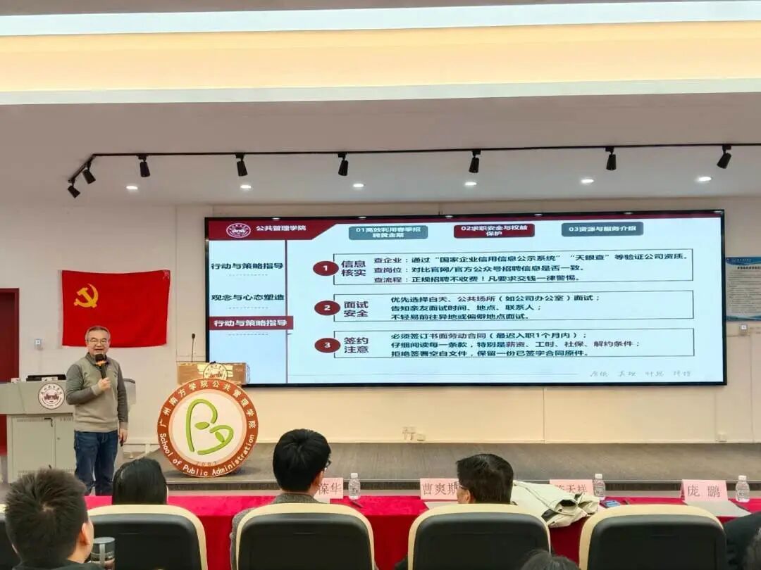 陈天祥院长围绕形势政策、心态塑造与行动策略三大维度为同学们提供了全方位指导。他深入剖析了当前就业市场,指出人工智能、新能源等新兴领域需求旺盛,并详细解读了社保激励、青年驿站等政策红利,强调政策导向已转向“人岗精准匹配”。在心态方面,陈院长寄语同学们做好自我评估,秉持“先就业、后择业”的务实理念,在实践中积累经验。同时,他建议同学们充分利用资源优化简历、精准投递,并警惕求职陷阱,学院也将持续提供信息平台与个性化指导,成为同学们坚实的后盾。