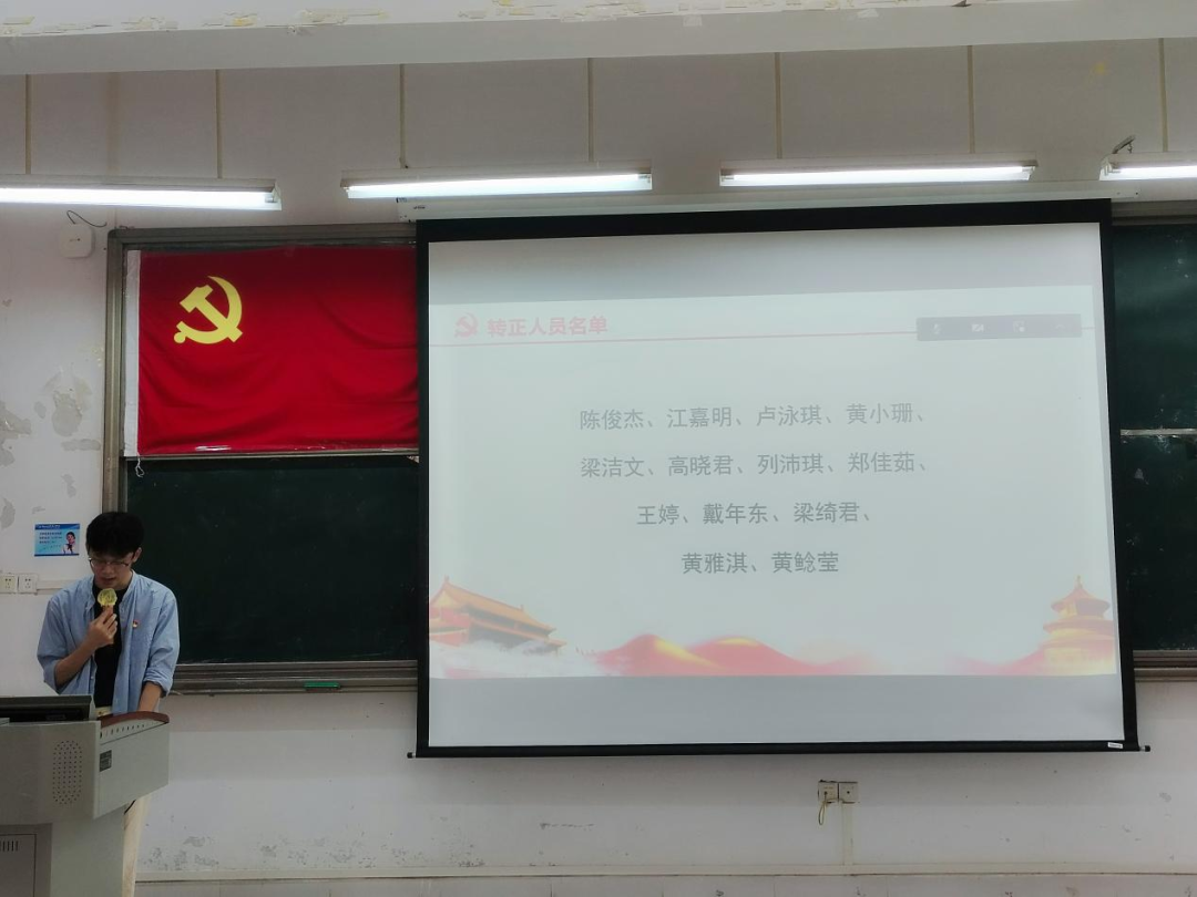 陈俊杰、江嘉明等29名预备党员依次上台汇报各自在预备期内的思想、学习、工作以及生活中的表现。随后,入党介绍人分别对29名预备党员在预备期内的表现情况作总结评价。接下来,大会采用无记名投票的方式对是否同意29名预备党员的转正申请进行了表决。经计票统计,支部与会党员一致同意29名同志按期转正。