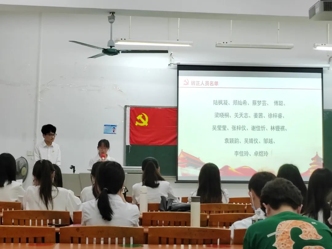 陆枫凝、郑灿希等17名预备党员依次上台汇报预备期间的思想、工作以及学习情况。紧接着,由入党介绍人分别对17名预备党员在预备期内的表现情况进行了总结。随后,大会采用无记名投票的方式对是否同意17名预备党员的转正申请进行了表决。经计票统计,支部与会党员一致同意17名同志按期转正。