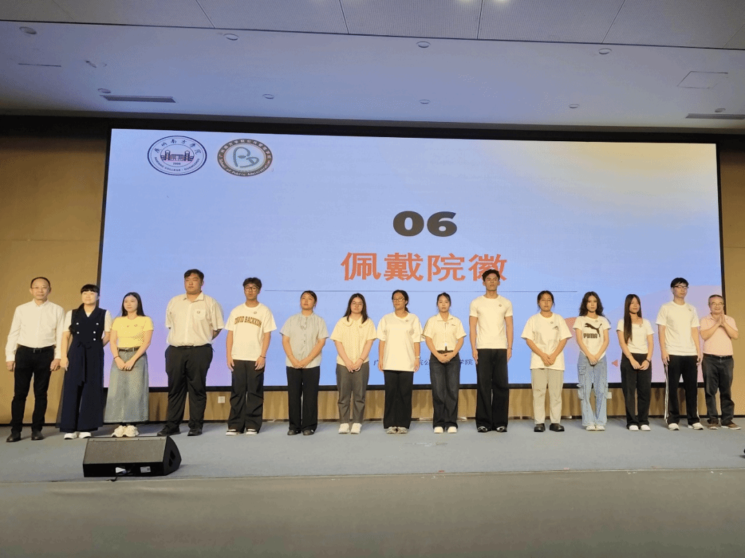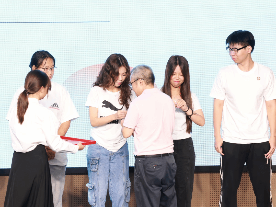 典礼接近尾声,陈天祥院长、欧崇亚副院长、史娜副院长为学生代表佩戴院徽。公共管理学院的院徽是两颗发芽的种子,象征着蓬勃活力与朝气,院训为 “奋发、担当、诚信、和谐”,希望新生牢记院训,发扬公管精神。