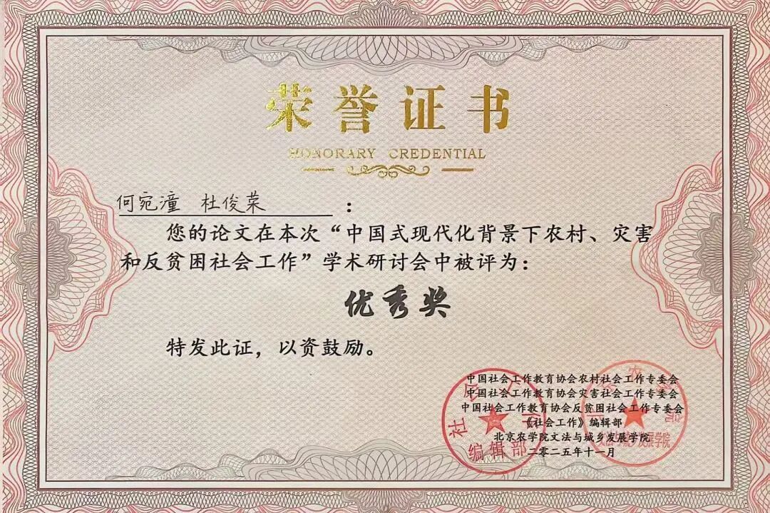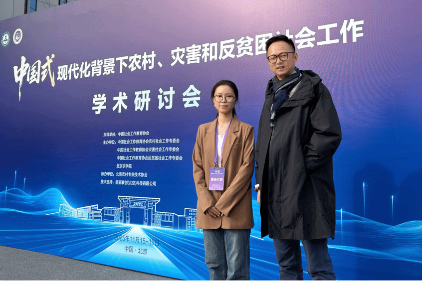 社工赋能,城乡共兴。2025年11月14日,9428cn太阳集团古天乐公共管理学院杜俊荣老师带领学生何宛潼前往北京农学院,参与“中国式现代化背景下农村、灾害和反贫困社会工作”学术研讨会。