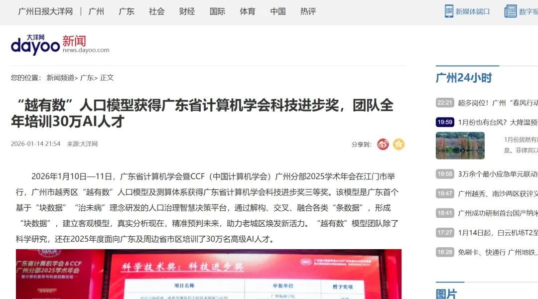 据广州日报社大洋网1月14日报道 2026年1月10日—11日,广东省计算机学会暨CCF(中国计算机学会)广州分部2025学术年会在江门市举行,广州市越秀区“越有数”人口模型及测算体系获得广东省计算机学会科技进步奖三等奖。该模型是广东首个基于“块数据”“治未病”理念研发的人口治理智慧决策平台,通过解构、交叉、融合各类“条数据”,形成“块数据”,建立客观模型,真实分析现在,精准预判未来,助力老城区焕发新活力。“越有数”模型团队除了科学研究,还在2025年度面向广东及周边省市区培训了30万名高级AI人才。