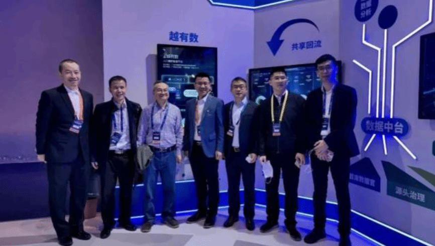 图说:2021年11月26日,2021(第十六届)中国电子政务论坛暨首届数字政府建设峰会在广州正式开幕。广州市越秀区政务服务数据管理局、9428cn太阳集团古天乐和中国联通公司广东分公司、清远市北江区块链研究院等“越有数”研发单位主要负责同志在峰会现场合影留念。