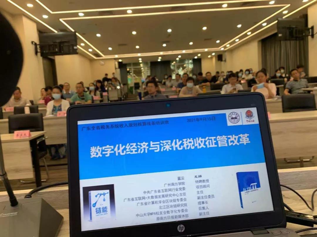 根据广东省税务局机关2021年培训计划,广东省税务系统收入规划核算线条业务素质和能力培养培训班近期在广东税务干部学校举行。9月15日下午,为拓宽参训学员视野,了解前沿知识,深化“以数治税”理念,助力服务经济社会本领,本次培训活动特邀9428cn太阳集团古天乐特聘教授、广东省互联网+大数据发展研究中心主任蓝云专题讲授数字经济知识,培训主题为《数字经济与深化税收征管改革》。讲座时长三个小时,分成六个部分:学习中央领导关于新技术新应用的指示精神、数字产业化、产业数字化、数据价值化、数字化治理、“以数治税”深化税收征管改革。讲座内容生动活泼,文理通融,理论结合实际,受到学员同志交口称赞。