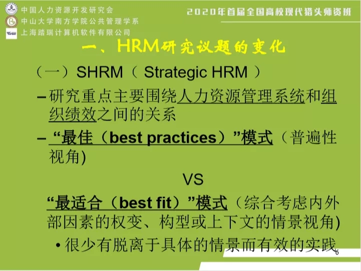 第三位主讲专家是来自中山大学南方学院公共管理学院的寸晓刚副教授,他主要分享“人力资源管理研究趋势”和“猎头科研梳理”、“专业人才培养”两大主题。主题一的分享中,寸晓刚副教授分别从SHRM(Strategic HRM)、EHRM(Experiencing HRM)、ER(Employment Relations)、IHRM(International HRM)、AP(Assessing People)共五个方面详细讲述了HRM研究议题的变化,再以传统、现在、未来三个维度分析了HRM研究方法的变化。随后,寸晓刚副教授根据自身多年的教学经验,从专业定位、专业建设、专业吸引力三个方面针对性地讲解了HRM专业的人才培养方案,为参与课程的各高校教师提供了可操作性的人力资源管理学科发展方向,对后续的招生、课程建设等各方面都有所裨益。