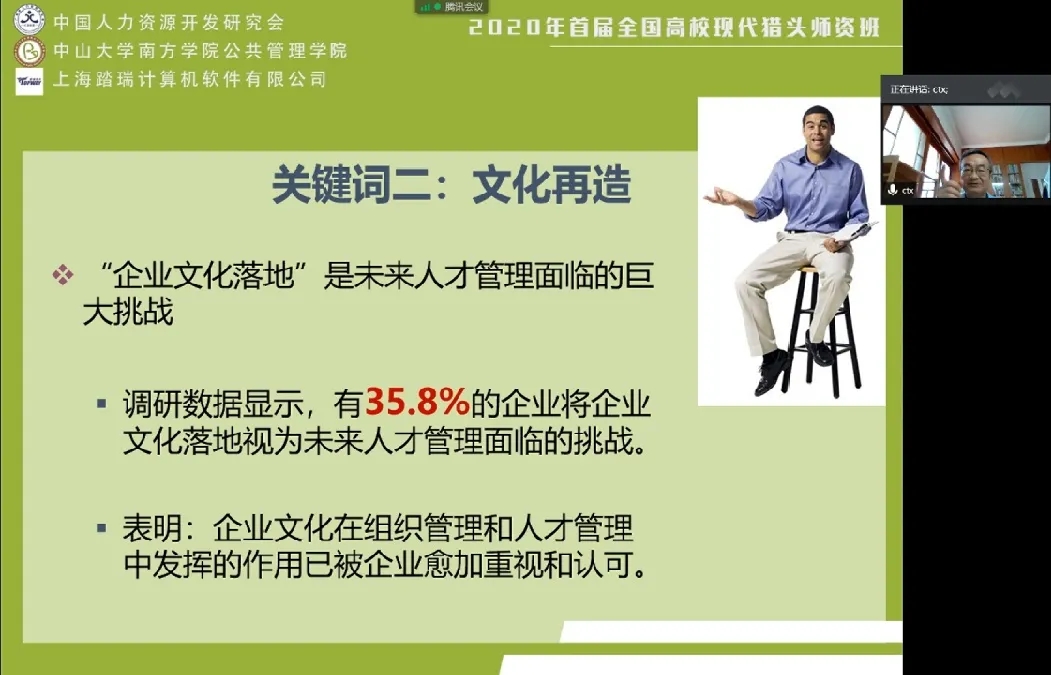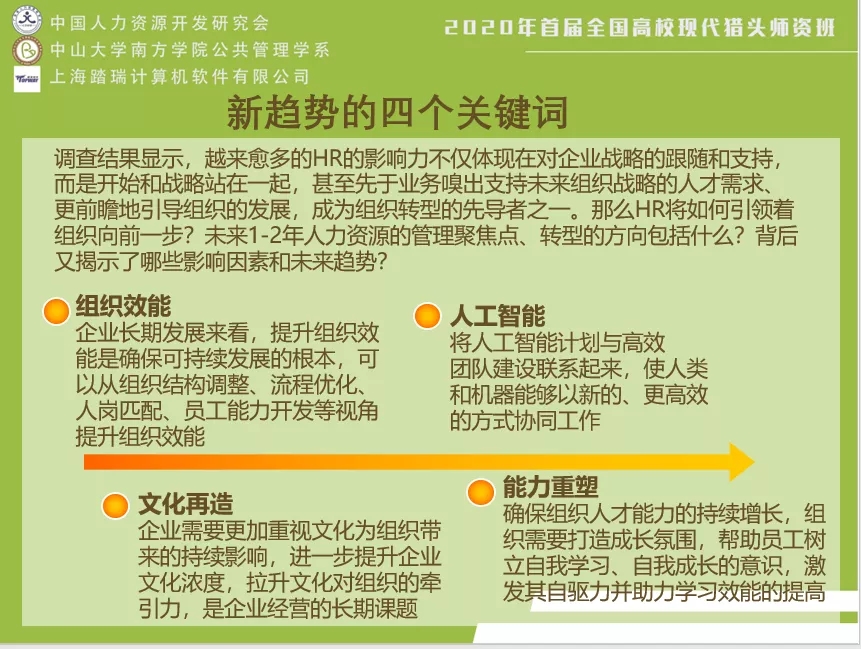 2020年8月8日上午, 由中国人力资源开发研究会主办,中山大学南方学院公共管理学院、中山大学南方学院国家猎头研究与培训中心承办,上海踏瑞计算机软件有限公司协办的首届全国高校猎头师资班(线上班)开班。