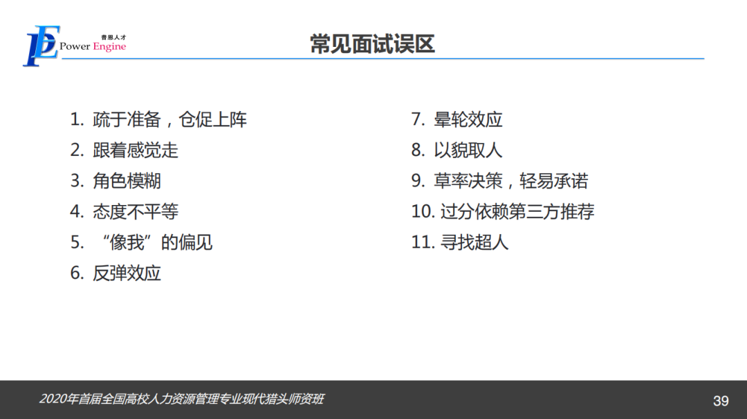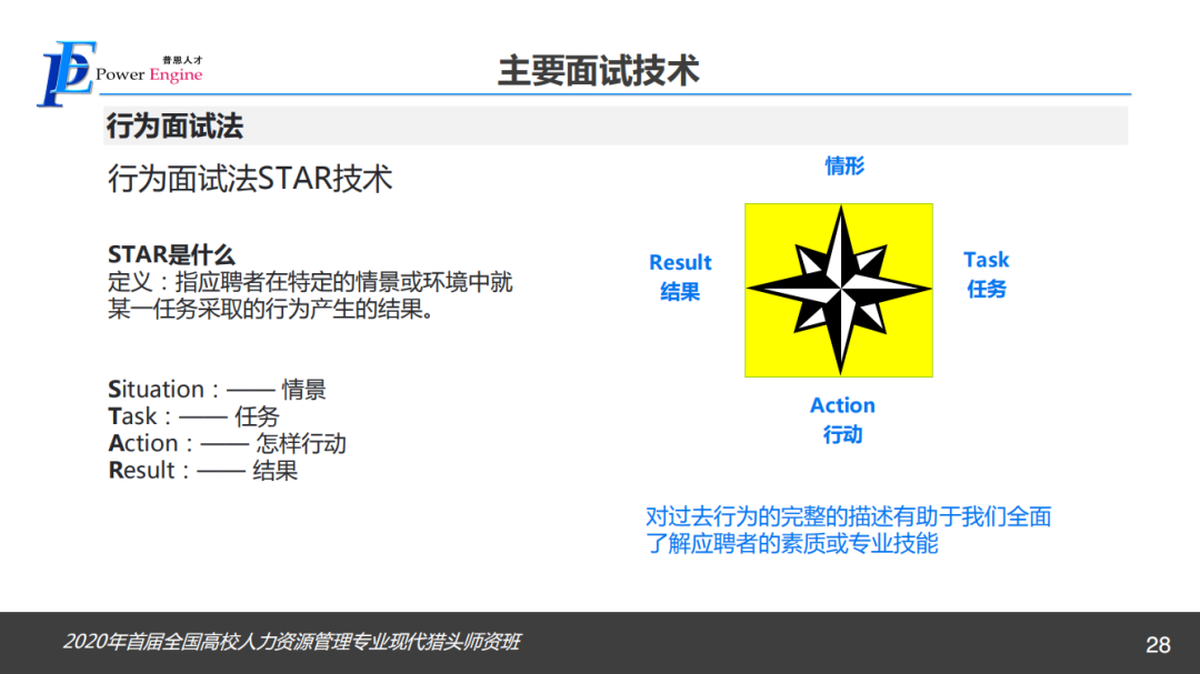 第三位主讲专家是来自广州普恩企业管理服务有限公司的首席运营官何霭莉女士,她做了“面试技术”的主题分享。她通过面试概述、面试核心确定、面试结构三个方面给学员讲解如何进行有效面试。她提到,面试是一种以谈话和观察为主要手段的考察,面试需要通过特定的问题挖掘自己想了解的信息、观察候选人、判断候选人所反馈信息的真伪、评价候选人的专业技能和综合能力。同时,何霭莉女士对行为面试法STAR技术进行了详细的阐述,并讲述了多种面试误区与评估方法,给学员提供了更深层次的思考。