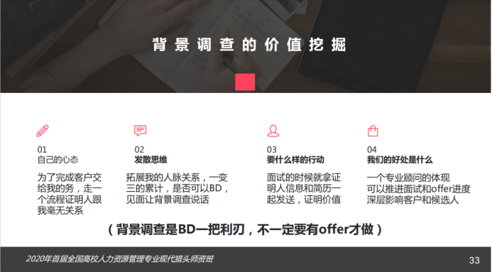 第二位主讲专家是来自广州铂桥企业管理咨询有限公司的全锦姬董事长,她分享的主题是“候选人背景调查”。全锦姬董事长分别从背景调查的起源与定义、目的与原则、项目内容、方法与渠道以及资料的分析整理共五个方面细致、全面地向学员们讲述应该如何进行候选人背景调查。她重点分析了背景调查的四大维度(工作经历、学历经历、8小时外的生活方式、家庭背景),还分享了工作经历核实的方法与渠道以及背景调查表问题设计的内容和技巧。她认为,充分的背景调查可以将职位理解错误、背景调查有问题等可控风险降到最低,从而实现猎头顾问的核心工作目标:出业绩,拿offer。