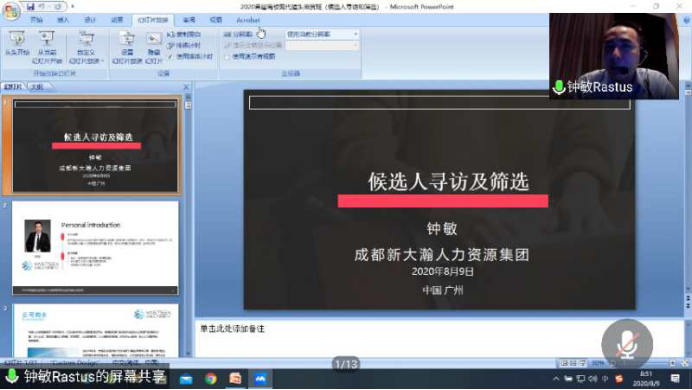2020年8月9日上午, 由中国人力资源开发研究会主办,中山大学南方学院公共管理学院、中山大学南方学院国家猎头研究与培训中心承办,上海踏瑞计算机软件有限公司协办的首届全国高校猎头师资班(线上班)第二天课程顺利开课。