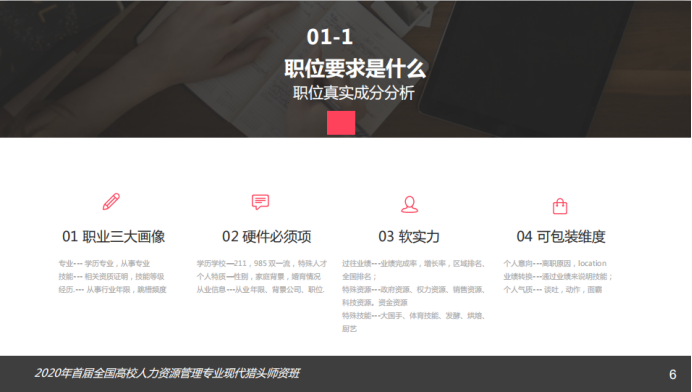 A:第一,持续的学习能力。由于猎头行业对人的要求很高,只有不断与时俱进才能站住脚。第二,保持淡定的能力。在候选人没有入职前,一切都还存在着风险,要保持随时准备着的状态,不能乱了阵脚。
