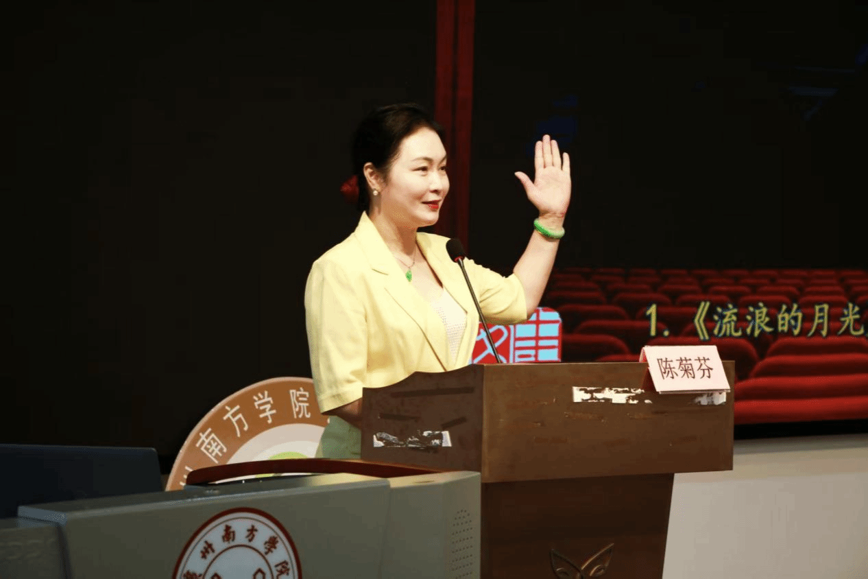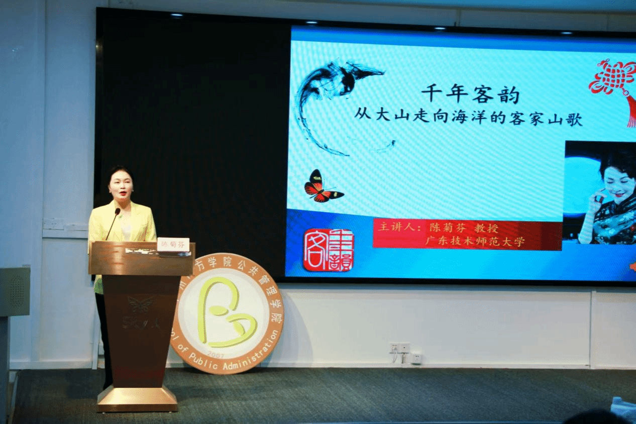 陈菊芬老师以千年客韵为题,先介绍了客家山歌的精髓,具有高度文化认同和文化自信等特点,后以寻根篇、问道篇、美学篇、创新篇四个篇章为基,总结出客家人是主要聚居于南方地区的汉民族的一支重要支系,随即通过客家山歌视频,为师生呈现了客家山歌背后蕴藏的价值和文化风情,展现了客家文化在全球的影响。在美学篇中,更是着墨于有着难得可贵的高尚品质客家妇女,她们推动着整个客家族群的发展,随之演变的客家情歌更是历久弥新,独具特色。