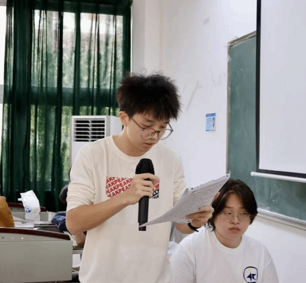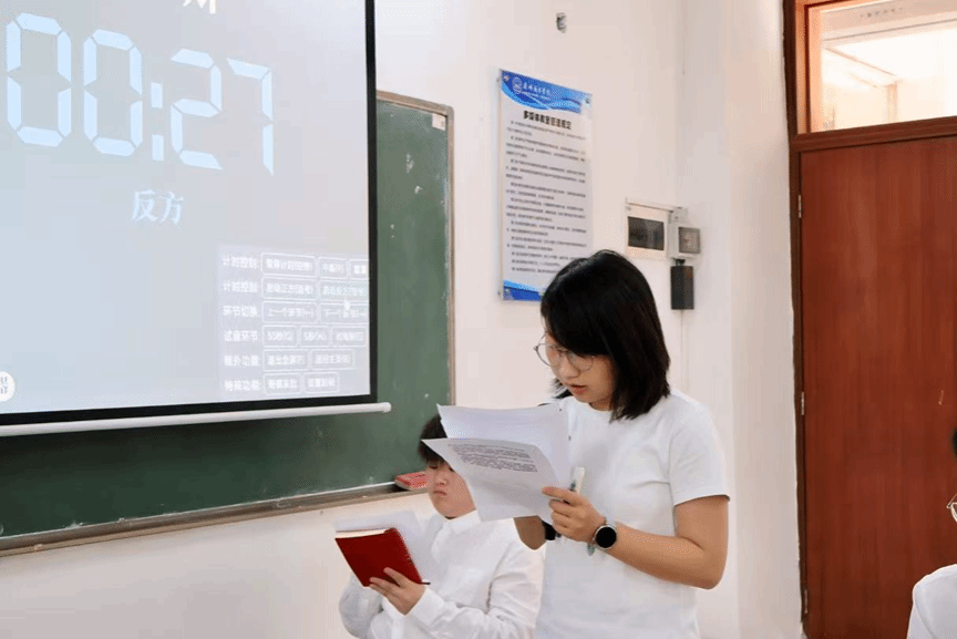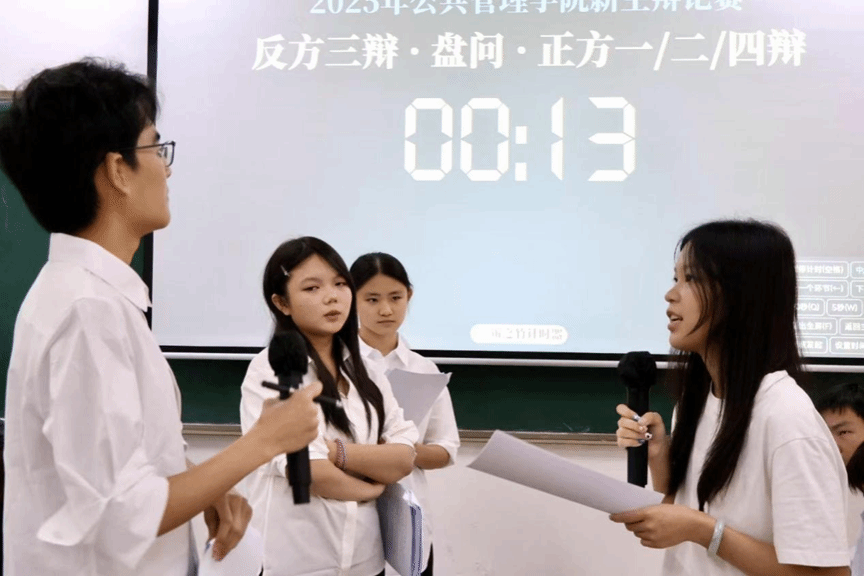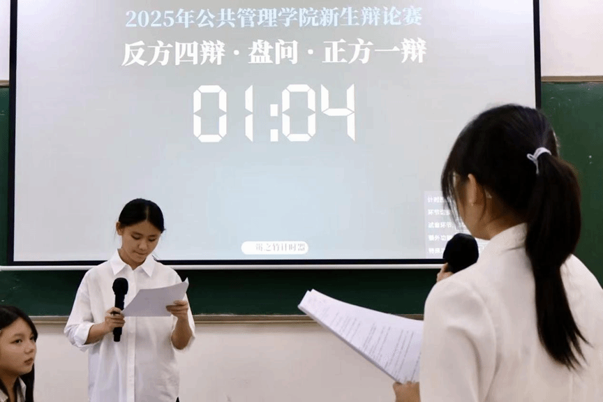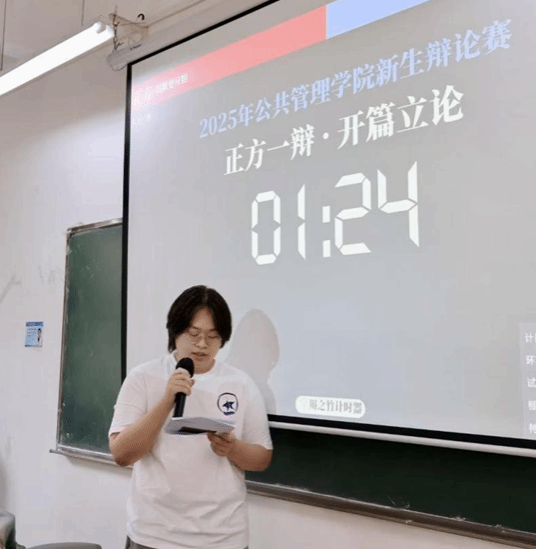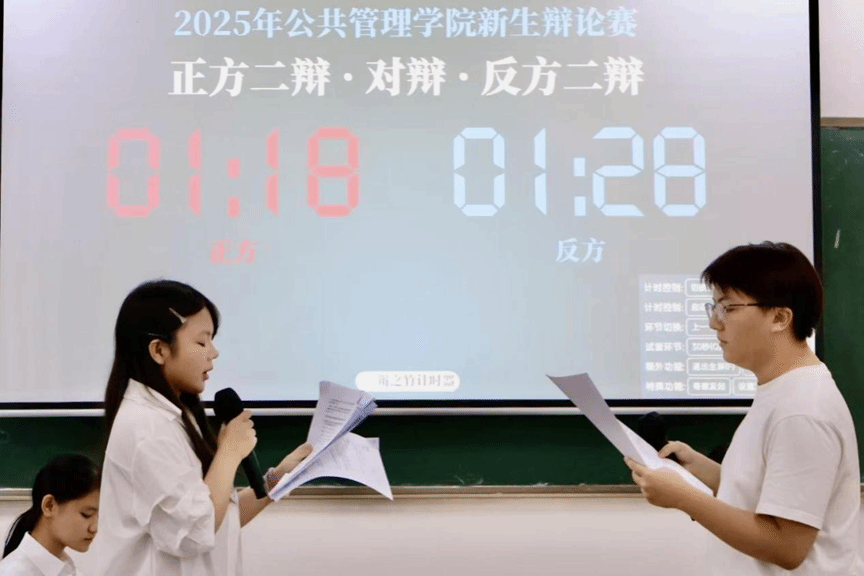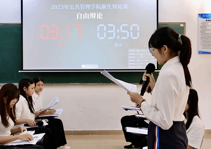 文华交锋,以理聚贤。2025年10月25日14点00分在九教205室,公共管理学院辩论赛半决赛如约启幕。莅临现场的嘉宾公共管理学院纵横辩论队副队长陈晓彤,公共管理学院纵横辩论队教练钟旻妍,外国语学院承曦辩论队副队长龙梓航。