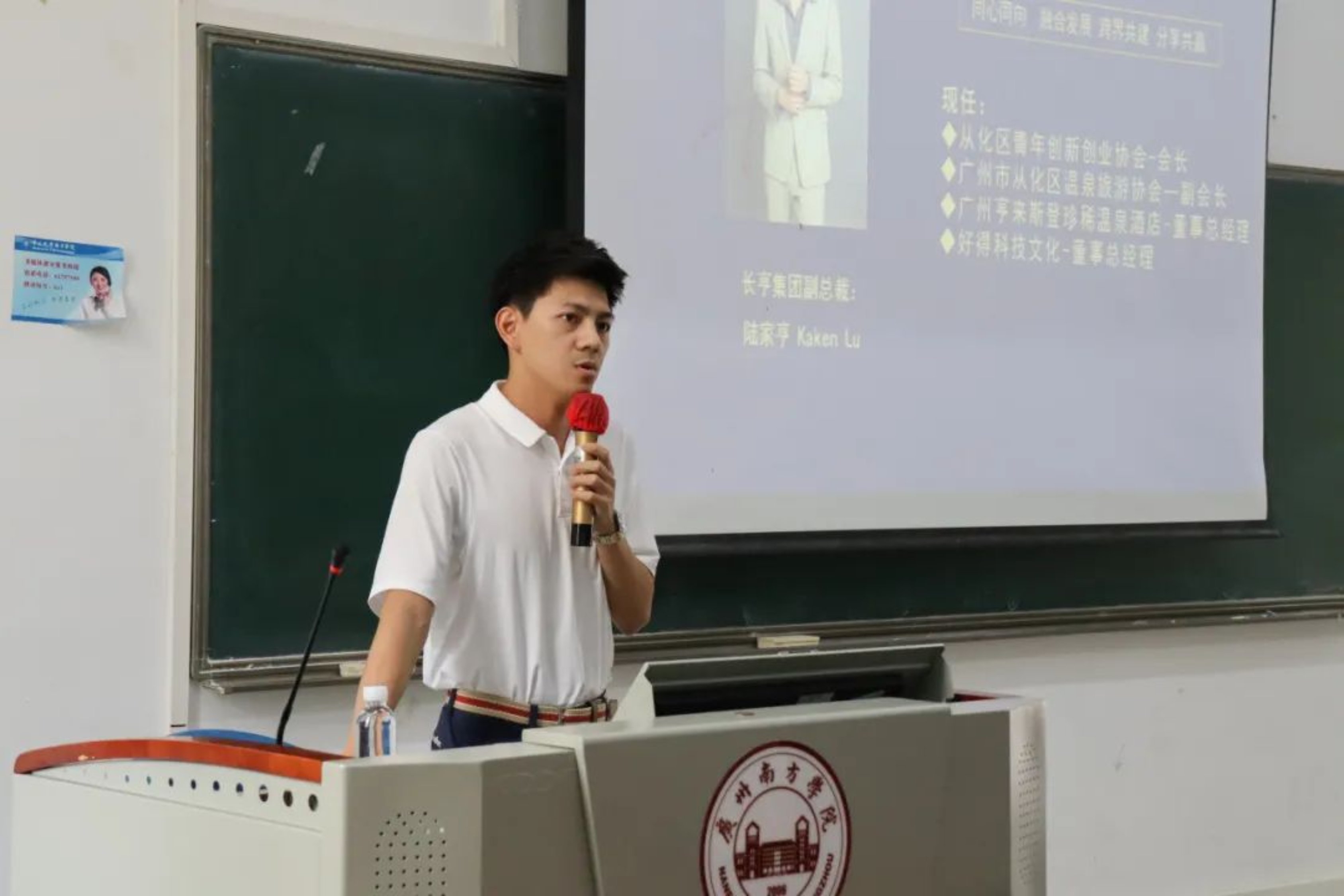 2023年9月13日下午,“新时代•南苑风”公共管理活动月之校企合作项目——文旅主播养成计划宣讲会在6教202举行,长亨集团副总裁陆家亨、亨来斯登酒店常务总经理于童、好得科技Chris老师、文化产业管理专业系主任周先捷老师、文化产业管理专业教师潘晓蝶、公共关系学专业教师蒋代晋出席了此次宣讲会。