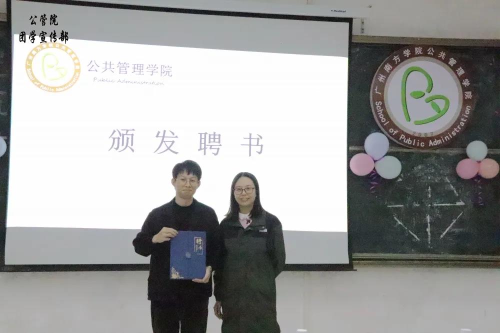 赖昀充老师为公共管理学院团总支学生会艺术顾问陈明辉老师颁发聘书。