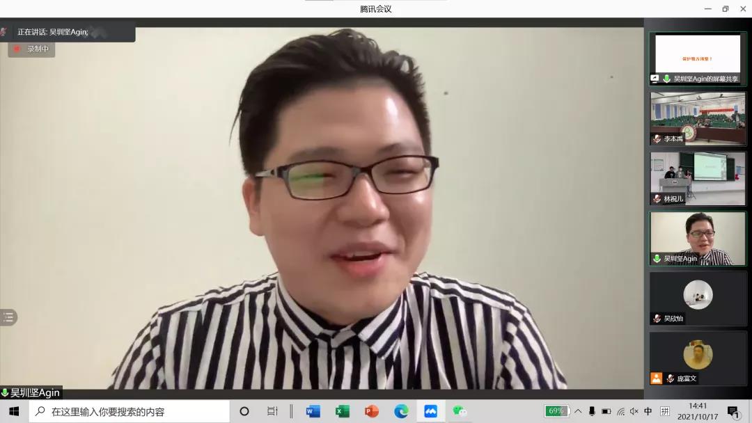接下来,就是活动的重头戏。第一位进行分享的是来自2019届的吴圳坚师兄,他提出三个要点:在学习时要眼光往前,杜绝无效社交和假努力;在实习时要放宽视野,多去尝试;在就业时要放大格局,虚心请教学习,成为自己想要成为的人。