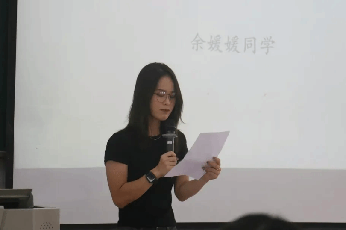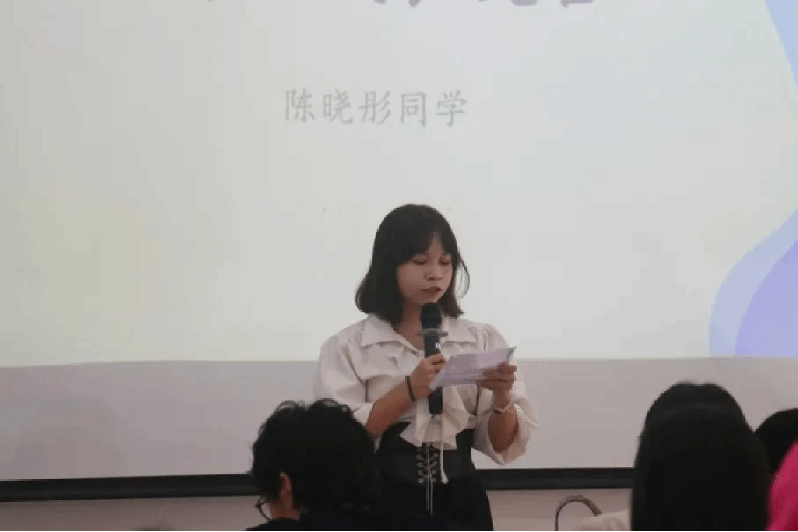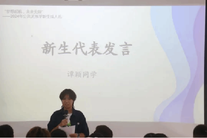 在新生代表发言环节,三位新生代表依次登台发表演讲。谭颖同学分享了她对大学生活的热切期待。“大学生活是充满挑战和机遇的,希望我们能够互相支持,共同成长。”陈晓彤同学则注重谈论她对公共关系学的认识与期许。“我也相信,只要我们保持热情,努力追求,就一定能在公共关系的领域中找到自己的位置,实现人生价值。”余媛媛同学以昂扬自信的语调向同学们发出了激情号召。“从此刻起我们的人生半径开始扩大,以谦逊之心求知、以务实之态做事、以积极之姿成长。”