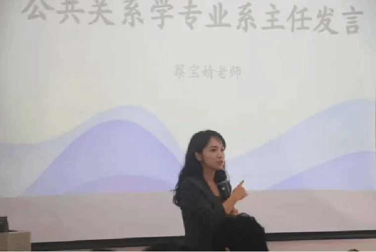 公共关系学专业系蔡宝婧主任在发言中表达了对新生们的期许。“到了大学最重要的是什么?最重要的是,要学会灵魂拷问。就是解决三个哲学问题-我是谁、我从哪里来、我到哪里去。”她以自身过往求学经历作为例子,引导同学们要以认识自我作为出发点,深入思考,明确未来大学生活的方向与目标。她还激励同学们在接下来的大学生活中,明晰大学课堂与高中课堂中思考方式的区别,学会主动做出选择。她以“命运一半是命,一半是我。”的昂扬语调激励青年学子们立足当下,深入了解好公关专业,在持续学习知识的同时,最终找到未来人生中那份能令自我满意的解答。