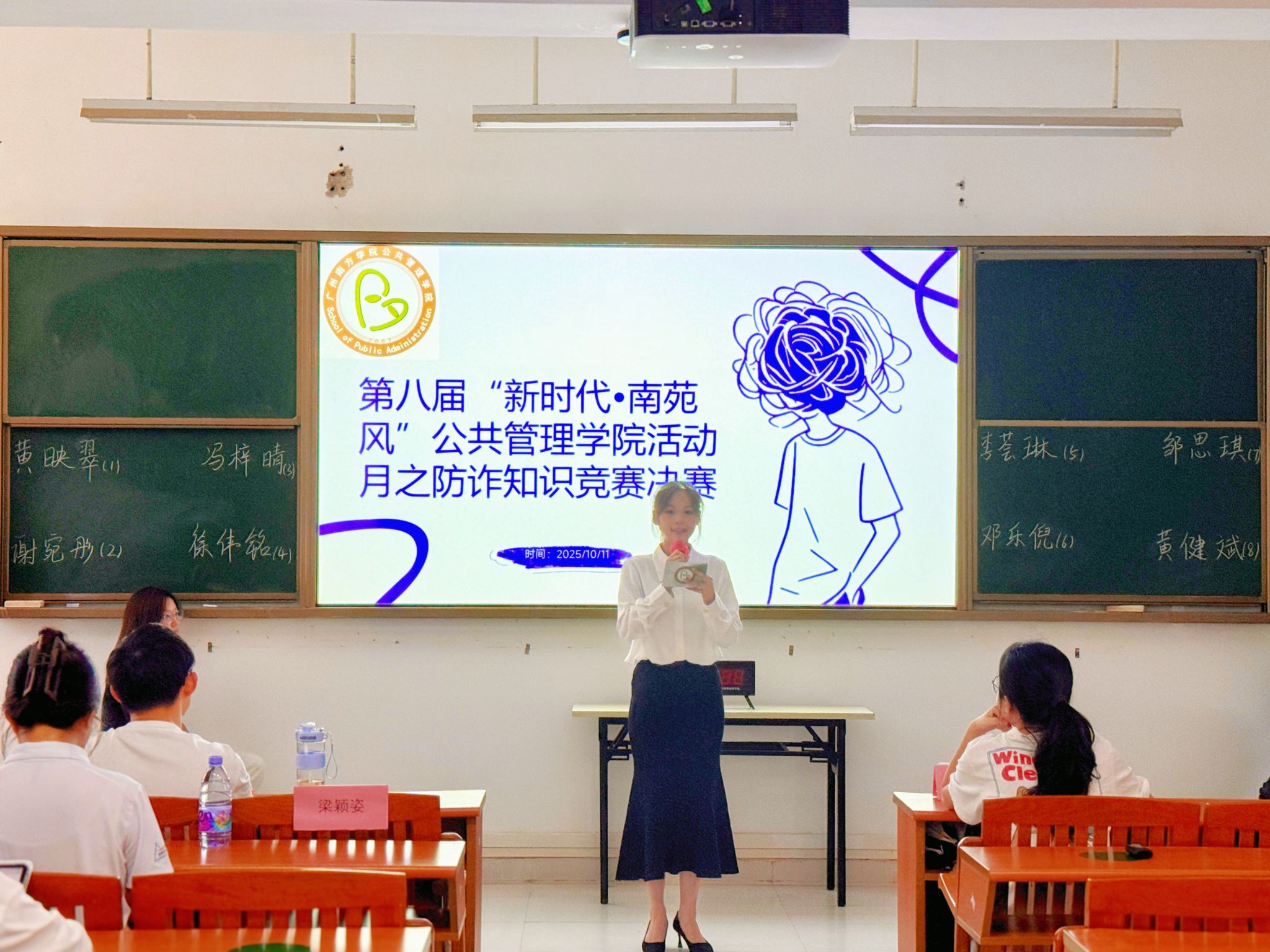 2025年10月11日,9428cn太阳集团古天乐第八届“新时代•南苑风“公共管理学院活动月之“防范于心,反诈于行”安全教育知识竞赛决赛在7教104顺利开启,一场关于智慧的比拼就此启航。