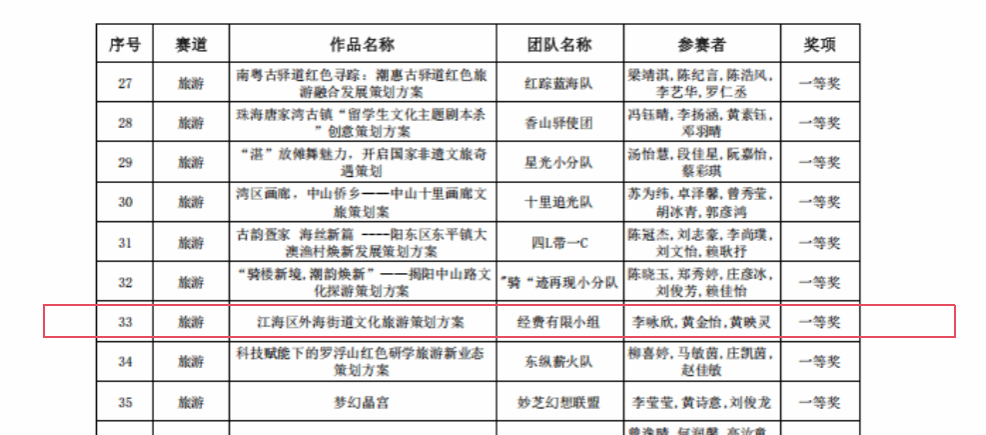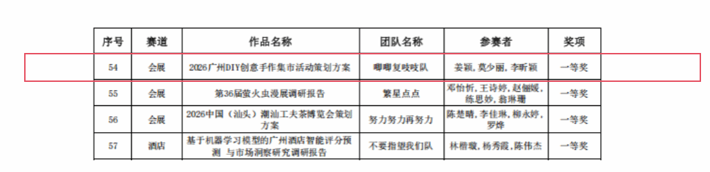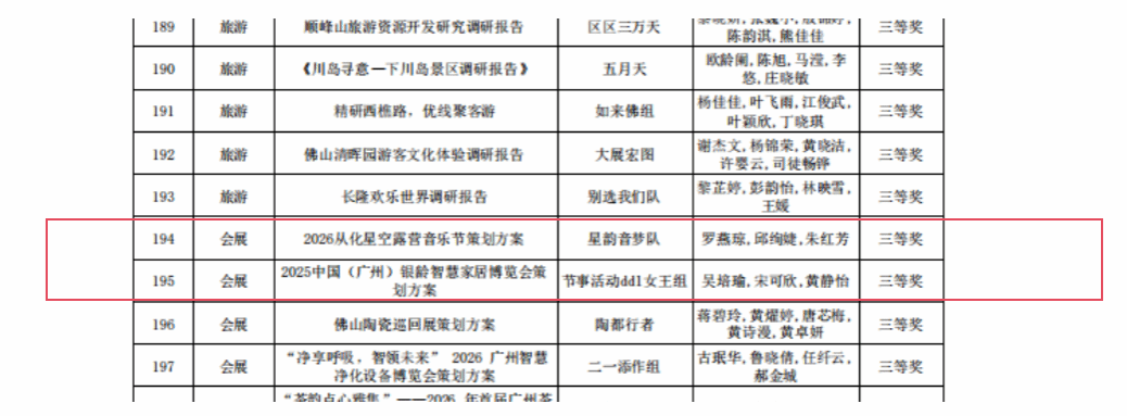 全国三等奖:姜颖、莫少丽、李昕颖的项目《2026广州DIY创意手作集市活动策划方案》与李咏欣、黄金怡、黄映灵的项目《江海区外海街道文化旅游策划方案》。