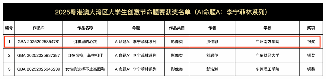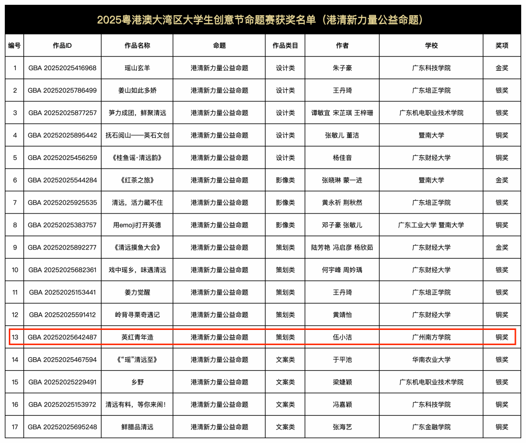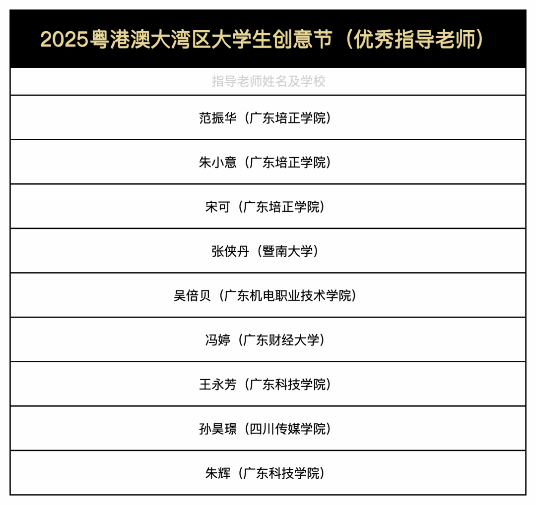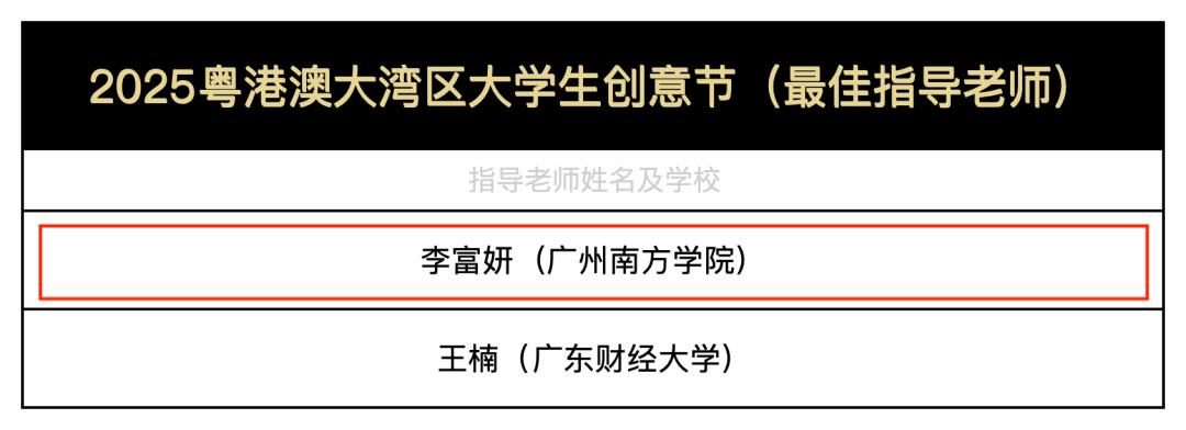 此次公共管理学院教师学子在2025粤港澳大湾区大学生创意节中总共斩获11项奖项,李富妍老师获最佳指导老师。这不仅是对文化产业管理专业《影像叙事实务》及《数字摄影摄像基础》课程教育教学成果的充分肯定,更是公共管理学院学子创新思维、实践能力与综合素养的生动展现,彰显了公共管理学院在培养高素质创意人才方面的扎实成效。同时,借助粤港澳大湾区创意交流平台,进一步拓宽了我院与湾区各院校、各领域的交流渠道,为后续深化创意教育、推动产学研融合、助力湾区青年创意人才培养奠定了坚实基础,也激励着我院全体师生继续深耕创意领域、奋勇争先,为湾区文化创意产业高质量发展贡献力量。