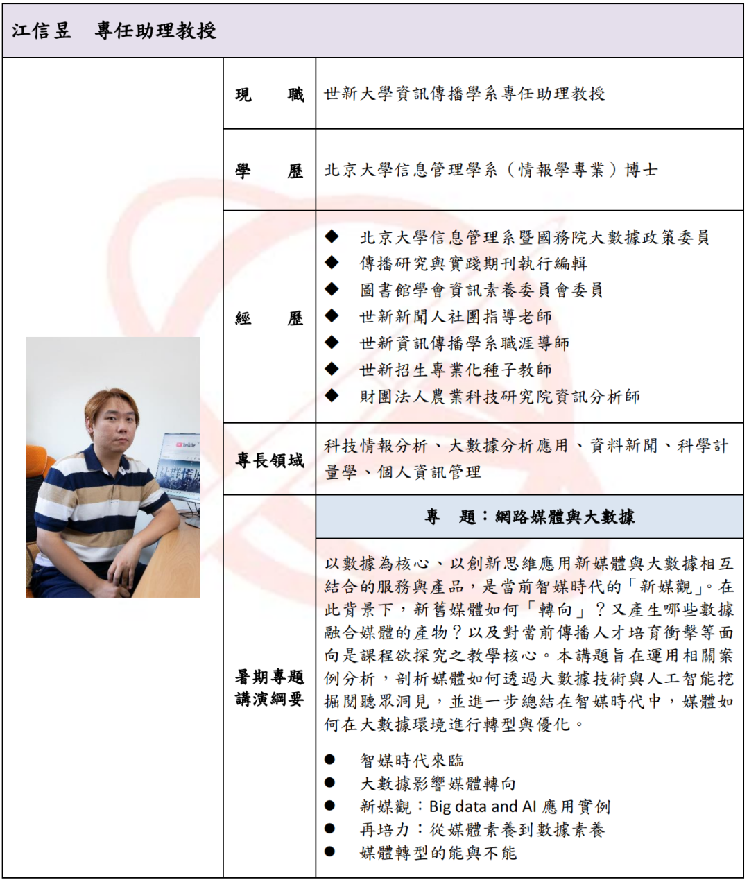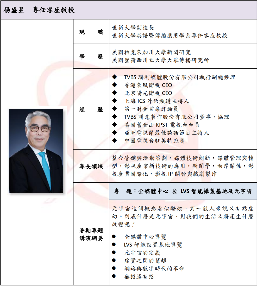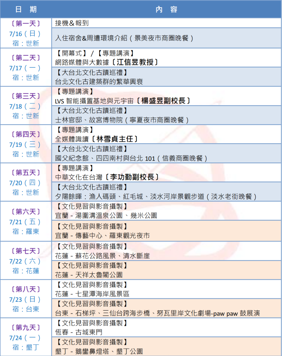 近年来,信息与传播技术发展日新月异,在数位多媒体世代,传媒模式渠道与使用习惯起了很大变化,传播知识与技术也跟着转变。为使海内外各界学子们都能体验到世新的各项专业,世新大学特别办理了「新媒体创作暨文化体验营」,让有兴趣了解传播新媒体的国内外师生们,有机会体验到传媒最新知识与设备外,更可透过研习营文化体验的见习过程,结合最新自媒体的多样功能,完成新媒体的学习与实际操作体验。