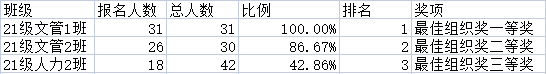 凡报名且提交了作品,以本班参赛人数占本班总人数比例(不得低于10%)的大小为原则,前三名班级可分别获得班级团建奖励500元,300元,200元,并为获奖班级颁发获奖证书及奖金。