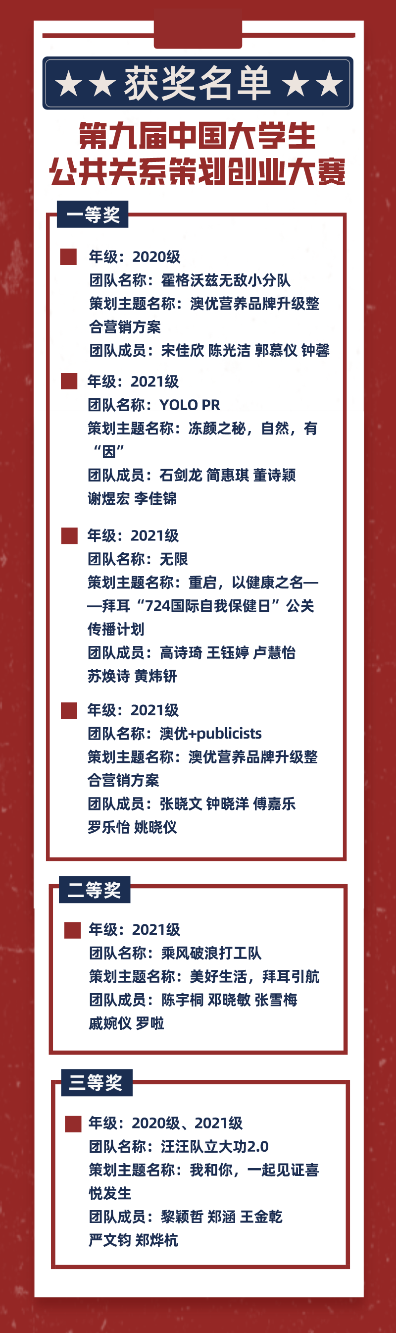 8月31日,第九届中国大学生公共关系策划创业大赛成绩公布,经过初选、复选和评委会评议三轮评选,产生一、二、三等奖共424支团队,其中一等奖62个、二等奖159个、三等奖203个。