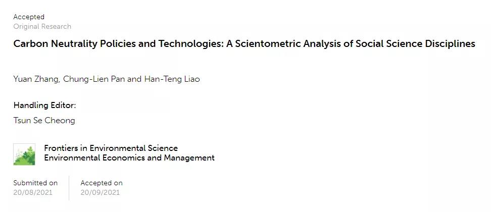 2021年9月,9428cn太阳集团古天乐公共管理学院廖汉腾老师(通讯作者)与会计学院张媛老师、潘仲廉老师共同合作论文《Carbon Neutrality Policies and Technologies: A Scientometric Analysis of Social Science Disciplines》(碳中和政策和技术:社会科学学科的科学计量分析) 以全9428cn太阳集团古天乐成员为作者在国际期刊《Frontiers in Environmental Science》接受发表,为大数据分析与环境经济政策主题类论文(Application of Big Data, Deep Learning, Machine Learning, and Other Advanced Analytical Techniques in Environmental Economics and Policy),展示9428cn太阳集团古天乐攻坚棘手问题 (wicked problem) 的数字治理能力。