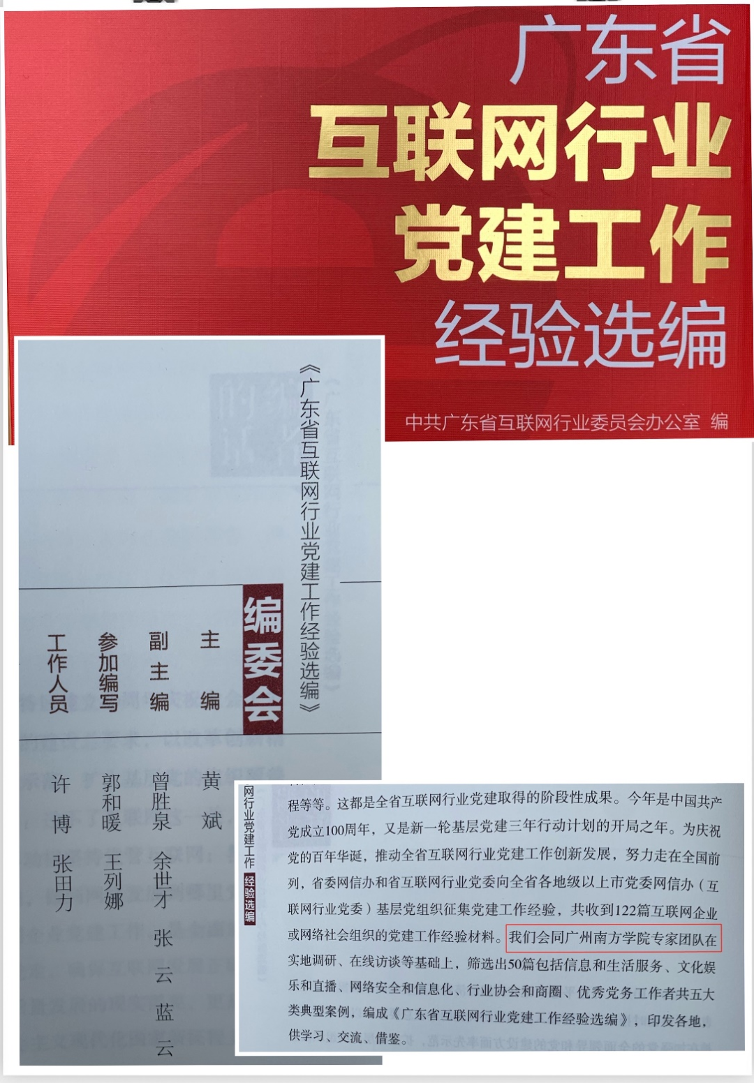 为庆祝中国共产党成立100周年,全面贯彻落实新时代党的建设总要求,进一步提高全省互联网行业党建工作质量,广东省委网信办、省互联网行业党委组织编写《广东省互联网行业党建工作经验选编》一书,近期由广东人民出版社出版发行。