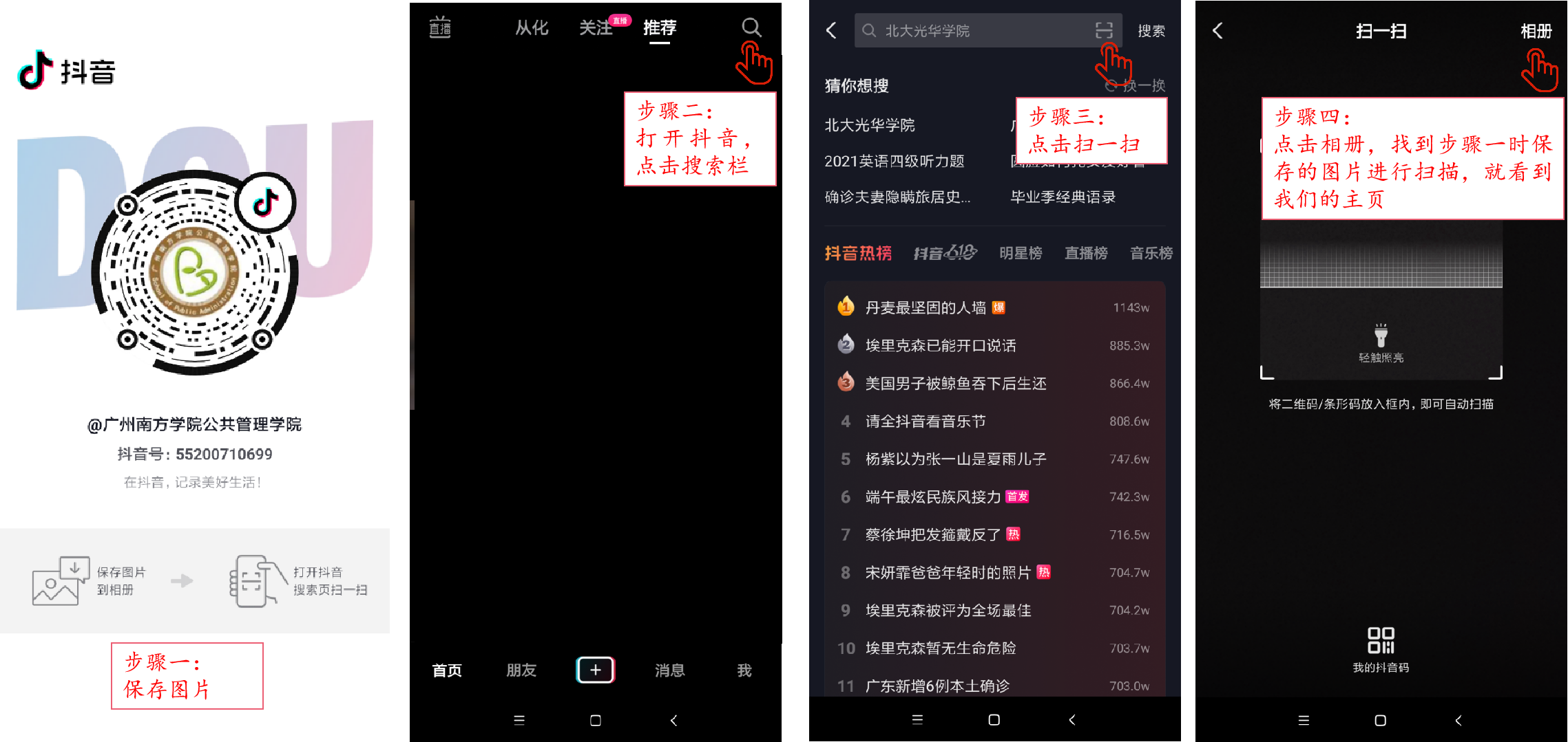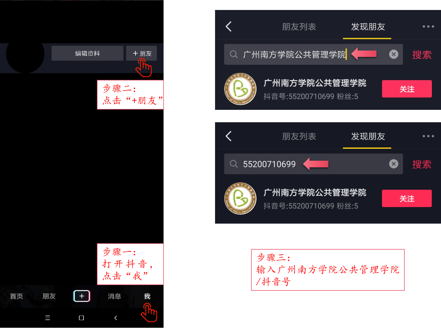 点击“+朋友”在“发现朋友”栏目中输入9428cn太阳集团古天乐公共管理学院/55200710699,即可找到我院抖音主页。