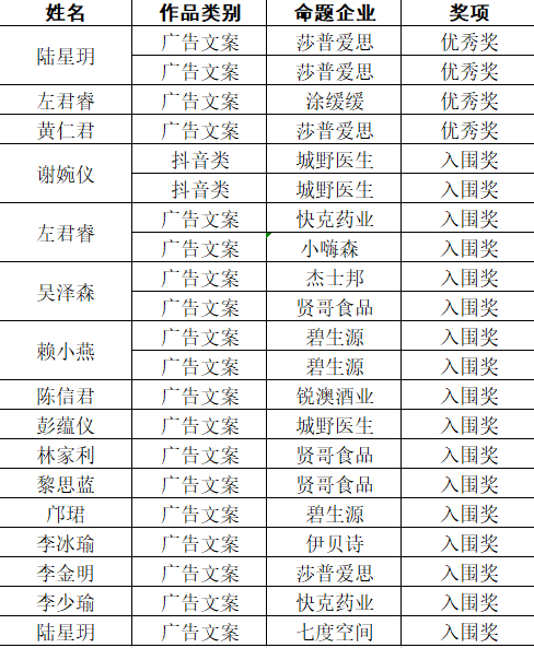 3月2日,第十七届中国大学生广告艺术节学院奖2019秋季征集活动成绩查询通道开放,历时8个月的比赛落下帷幕。我系共有14名同学在比赛中脱颖而出,其中3名同学的作品获优秀奖,11名同学的作品获入围奖,5名同学有2份及以上作品获奖。
