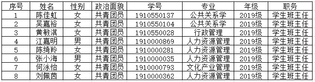 根据《中山大学南方学院学生班主任管理条例》的要求以及我系2020级学生班主任的选拔计划,经过28名申请者面试环节,由系辅导员、学导和学班10人组成面试小组,本着“公平、公正、公开”的原则投票决定,拟确定陈佳虹等8名同学为系2020级学生班主任,现在进入考察试用阶段,名单公示如下: