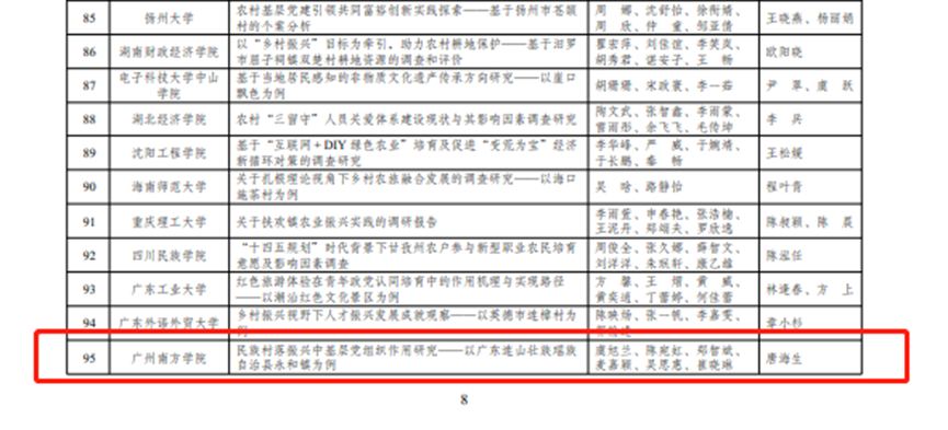 近日,在共青团中央2022年“三下乡”、“返家乡”社会实践优秀调研报告名单公示中,我院唐海生老师指导的,我院行政管理专业学生虞旭兰、陈宛虹、郑智斌、麦嘉颖等共同完成的调研报告《民族村落振兴中基层党组织作用研究——以广东连山壮族瑶族自治县永和镇为例》获优秀调研报告称号,这是我校首次获得此项荣誉。