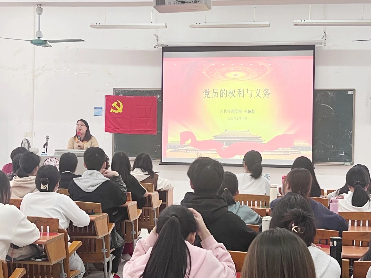 3月18日,公共管理学院党总支副书记张佩怡老师开展了主题为《党员的权利与义务》的党课培训。此次党课详细讲解了党员的权利与义务的基本内涵,强调了二者之间的关系及其重要性,同时指明了大学生如何正确行使党员权利,履行党员义务,鼓励同学们敢于担当且积极作为,争做合格党员。