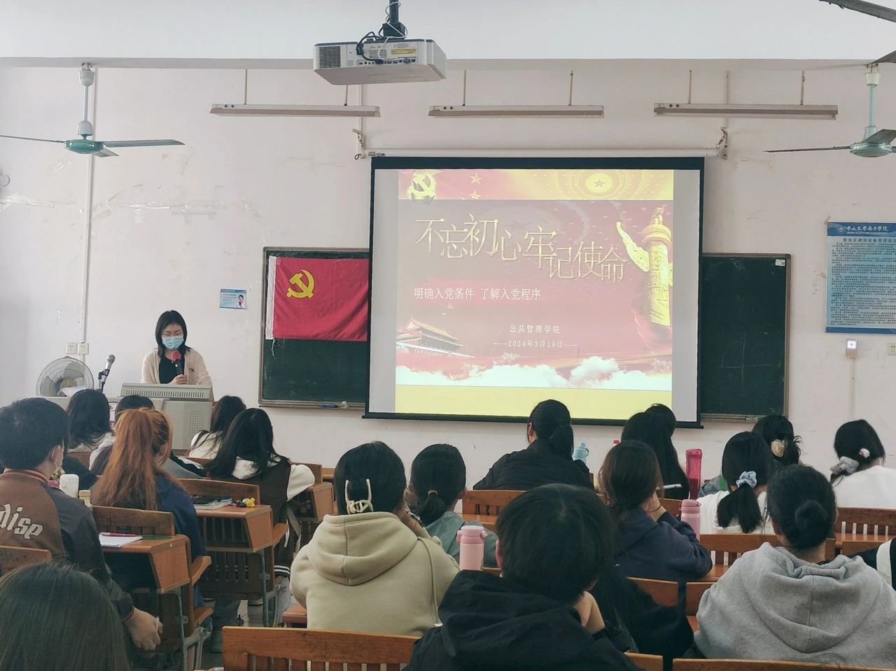 3月19日中午,公共管理学院学生党支部书记宣伟男老师面向34期积极分子开展了以《明确入党条件,了解入党程序》为主题的党课培训。此次党课从讲解申请入党的条件以及党员的标准展开,详细讲述了入党的各个阶段,明确发展程序,同时说明撰写思想汇报对党员有着重要意义。
