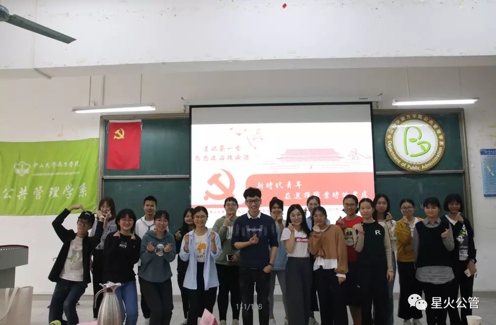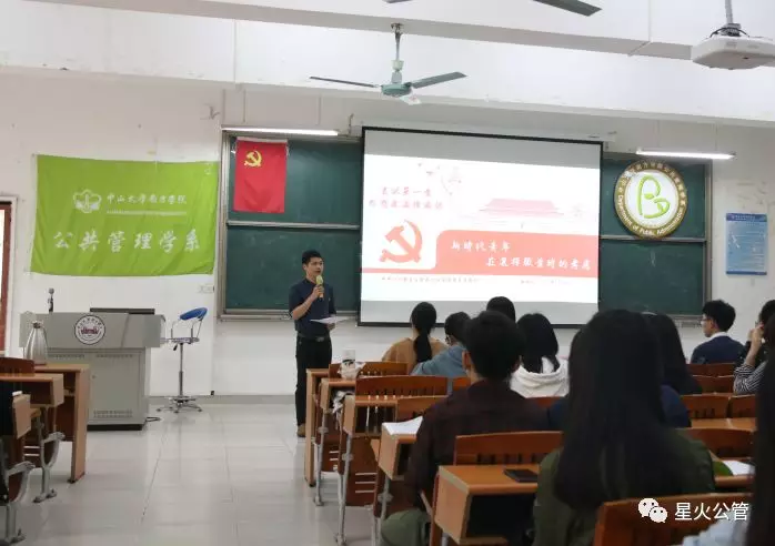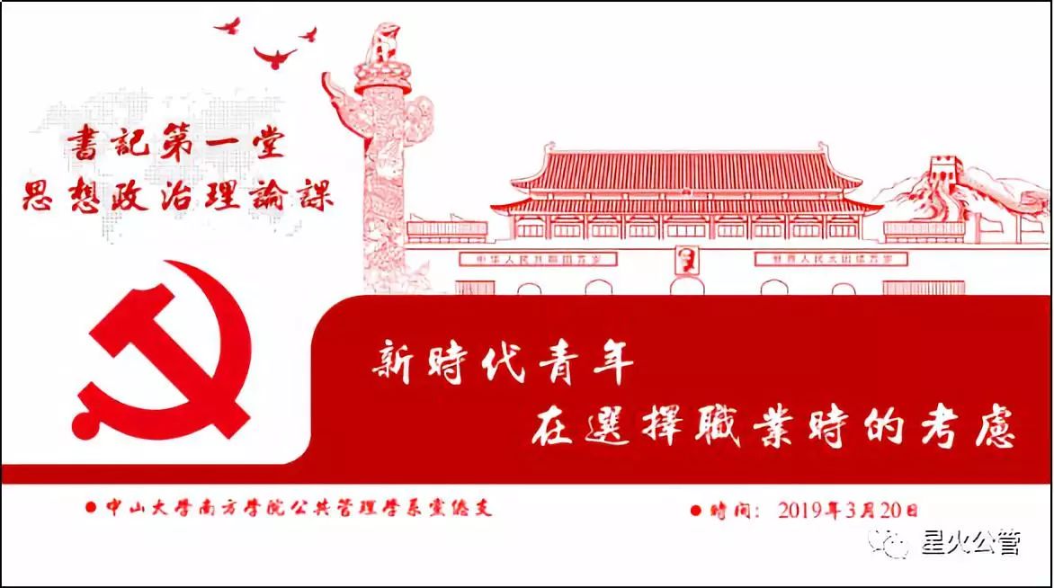 2019年3月20日下午,在5-205教室,公共管理学系党总支书记、系主任陈天祥同志给我系入党积极分子、发展对象以及学生党员们讲授了第一堂思想政治理论课——“新时代青年在选择职业时的考虑”。党总支副书记陈利斌同志主持了本次大会,人力学生支部书记卢诗杰同志出席了本次思想政治理论课。