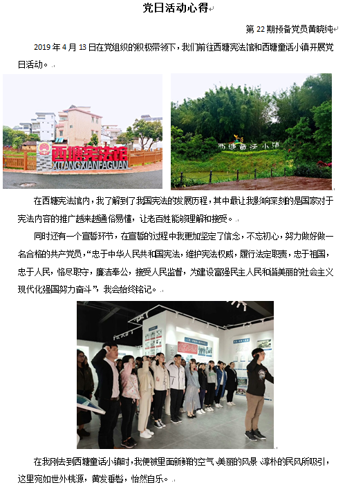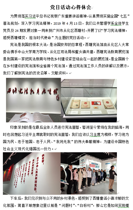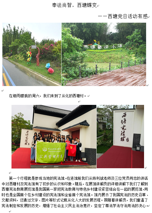 为了深入学习领会习近平总书记关于党的初心和使命的重要论述,贯彻我校2019年党委专题学习重点内容之“不忘初心、牢记使命”主题教育。4月13日,公共管理学系党总支组织我系学生党员以及发展对象前往从化西塘宪法教育展览馆以及从化西塘童话小镇开展一次“学习宪法精神,感受西塘蝶变,担当时代使命”主题党日活动。