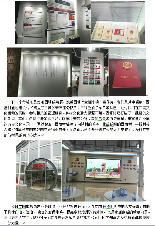 我们来到了西塘村委会,在讲解员的介绍下,我们观看了西塘蝶变宣传片,了解到了西塘村从过去的“问题村”变成如今 的“示范村”,过去基层党组织涣散、经济发展缺乏动力、治安案件频发等问题,在党和政府共同努力之下,尤其是在乡村振兴的战略背景下,西塘村结合自己的优势从“生态经济”入手,围绕“田园童话”的主题,大力发展现代农业、特色民宿等主导产业,农耕田缘、龟博园等企业的相继入驻,有效带动了西塘村现代观光农业和旅游业发展,如今建设成了一个村民安居乐业、村容村貌焕然一新的“示范”西塘村。