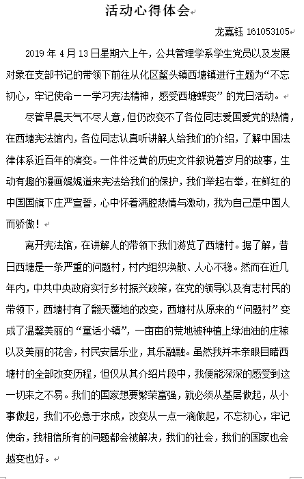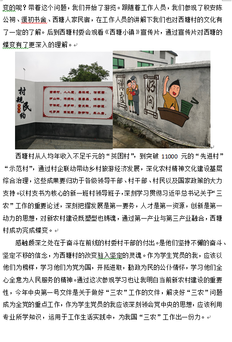此次党日活动的参观学习,各位同志感受到了西塘村的蝶变,了解乡村振兴背景下特色小镇的发展战略,更加深入地学习了宪法并将宪法精神带到自己的工作生活中去,希望将来能用自己的知识能力,对家乡、对社会、对国家有所担当,有所贡献,真正做到“不忘初心,牢记使命”,为建设社会主义现代化强国而努力奋斗!