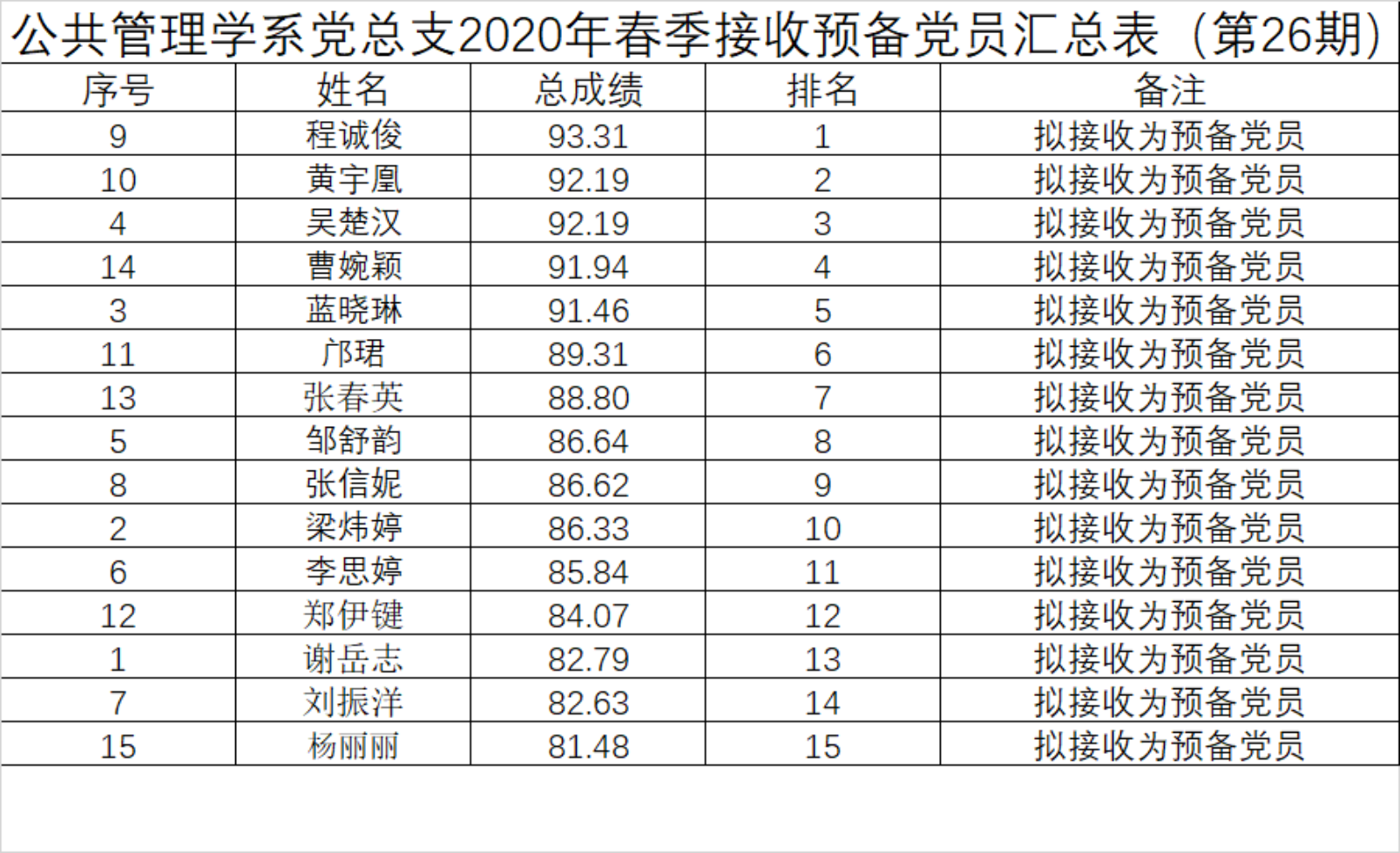 本次接收第26期预备党员工作顺利结束,此次考核成绩由学习强国学习情况(占比10%)、发展对象培训考试(占比45%)、党课讨论(占比45%)三个部分组成。经充分考察,最终拟接收程诚俊等15名发展对象为预备党员,具体结果公示如下: