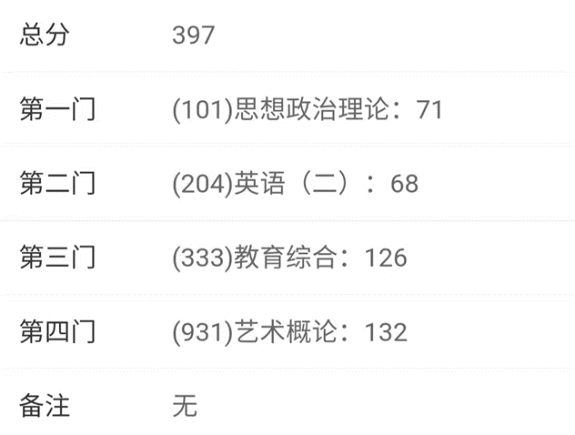 我的成绩是教育综合(333)126分,艺术概论(931)132分,英语(二)68分,政治71分,总分397分。
