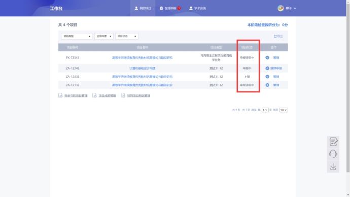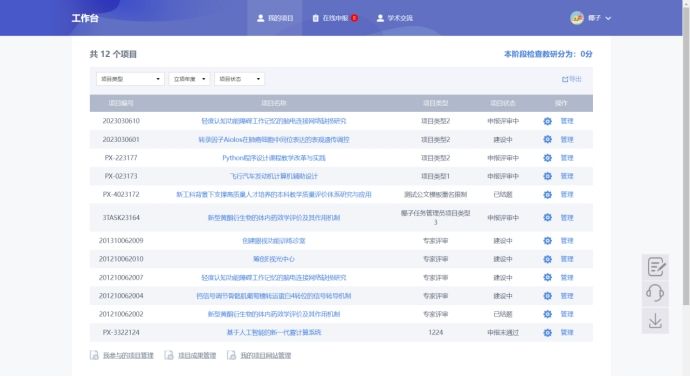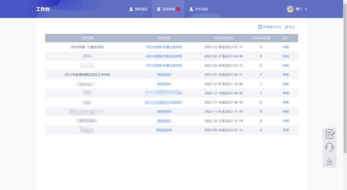 用户可以在此模块继续申报之前暂存未提交的项目、管理已提交申报的项目、跟踪项目状态。