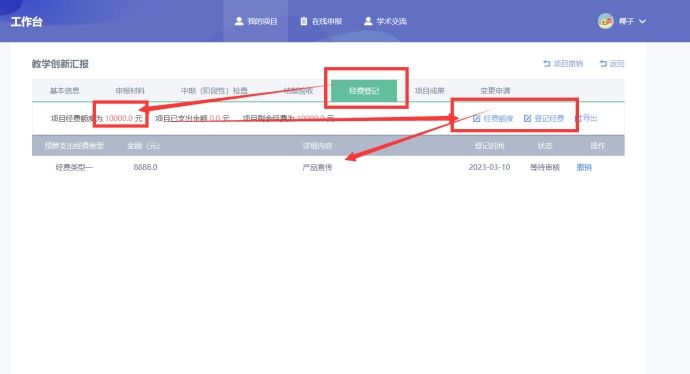 用户可以在“经费登记”页登记项目建设过程中的经费使用情况,提交即提交经费审核,管理员审核通过的经费登记项可打印报销单