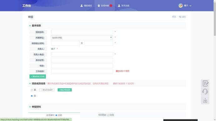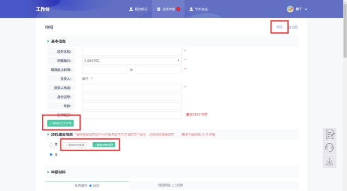 c. 填报页面右上角可以预览填写内容;自定义字段支持教师补充信息;项目负责人可以将项目参与人员添加到项目中。