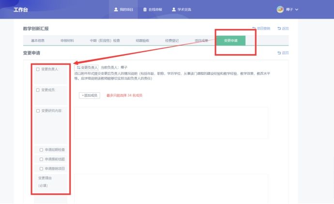 项目建设过程中,发生负责人变更、成员变更等等项目变化,可以在变更申请处发起项目变更申请,主办管理员审核通过后即可完成变更。