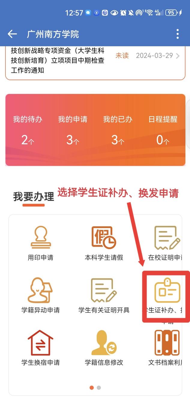 打开企业微信→点击工作台→点击办事大厅→点击学生证补办、换发申请→填写相关信息提交→等待申请通过后,携带本人一寸红底或者蓝底证件照到院系办公室办理即可