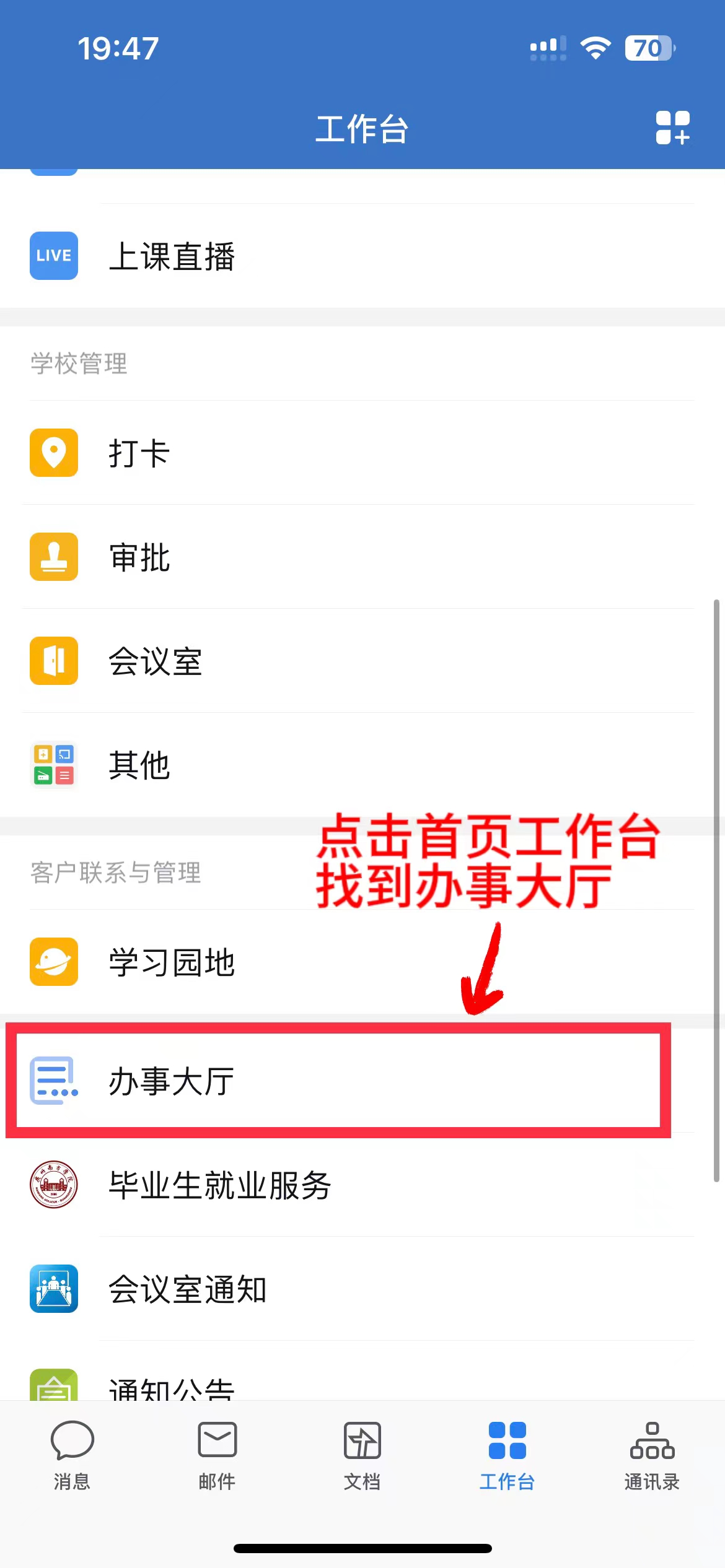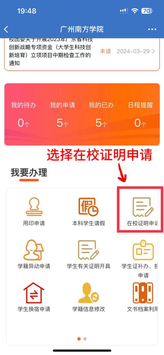 打开企业微信→点击工作台→点击办事大厅→选择在校证明申请→填写相关信息即可